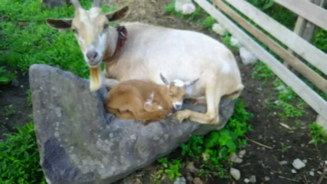夏の夜は山羊の親子も暑いのか石のソファーベッドで寝ています。 子ヤギが産まれて11日がたちすくすく成長しています。 お母さん山羊からはなれに甘えん坊のチチです♬ 子ヤギを見に遊びにいらしてください(^_-)-☆